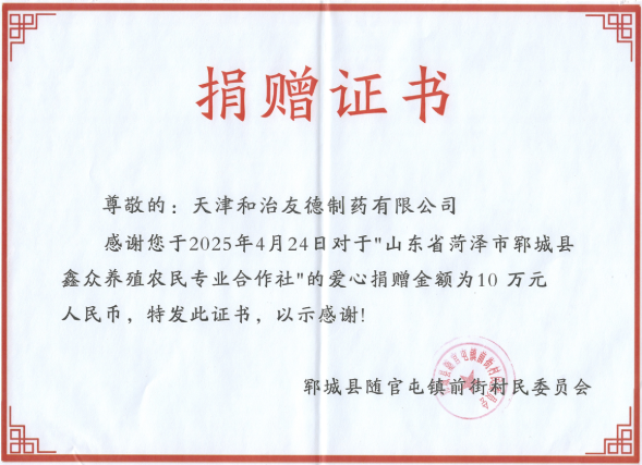 2025年山东郓城农民专业合作社捐赠证书